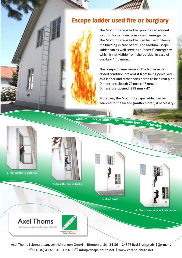 The Modum Escape ladder provides an elegant solution for self-rescue in case of emergency. The Modum Escape ladder can be used to leave the building in case of fire. The Modum Escape ladder can as well serve as a “secret” emergency exit, which is not visible from the outside, in case of burglary / intrusion. The compact dimensions of the ladder in its closed condition prevent it from being perceived as a ladder and rather considered to be a rain pipe. Dimensions closed: 72 mm x 47 mm. Dimensions opened: 398 mm x 47 mm. Moreover, the Modum Escape ladder can be adapted to the facade (multi-colored, if necessary).